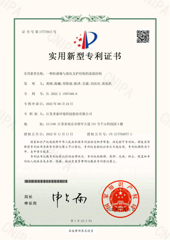公司资讯:公司总经理陈总参与研发的《一种防渗墙与基坑支护结构的连接结构》获得了“国家知识产权局”颁发的“实用新型专利证书”证书号第17775917号,专利号ZL2022 2 1597440 . 6。