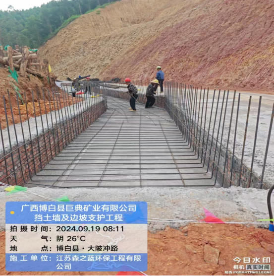 在鞭炮声中,由华北有色工程勘察院有限公司总承包、江苏森之蓝环保工程有限公司承建的博白县巨典矿业挡土墙及边坡支护工程正式开工。
