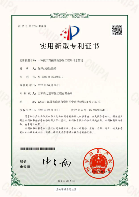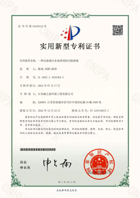 快讯:近日,由公司主要领导和骨干研发的《一种防渗墙与基坑支护结构的连接结构》《便于对接的防渗漏工程用排水管道》《反渗透污水处理用超滤结构》《方便进行清淤防污水渗透的方涵》《耐用型污水防渗透膜》《防渗漏工程用排水管道》等专利申请获批。被“国家知识产权局”授予“实用新型专利证书”。