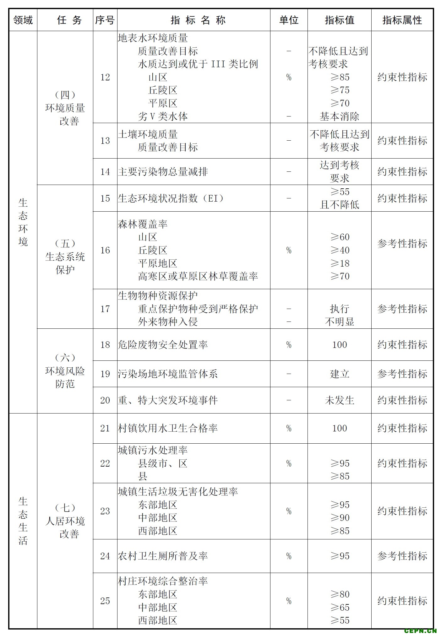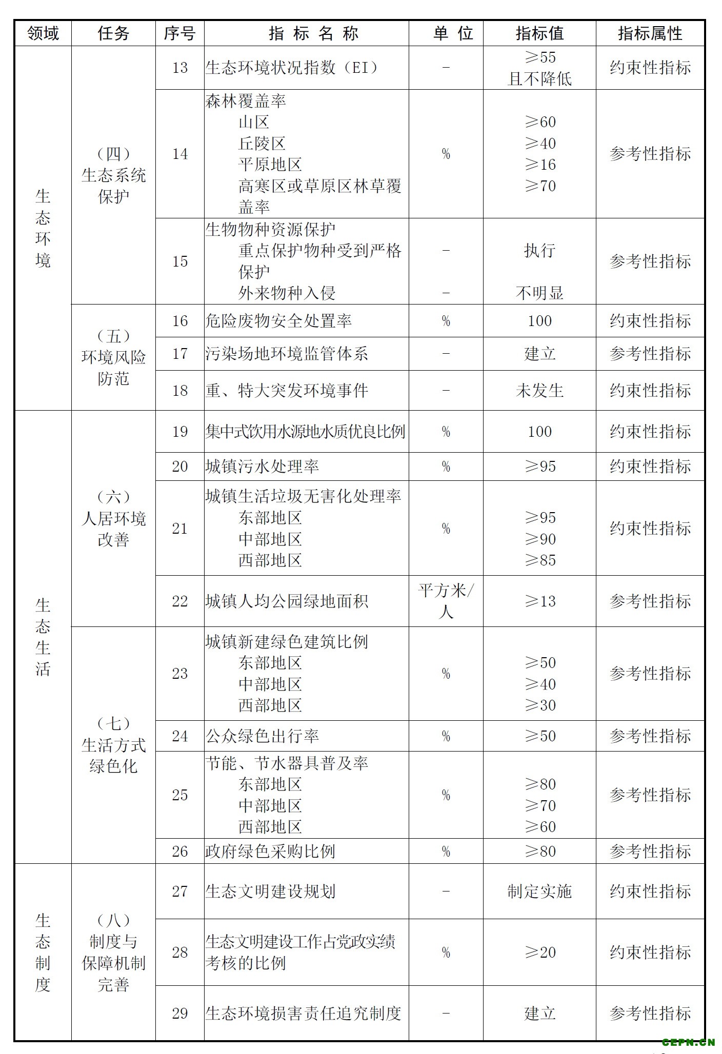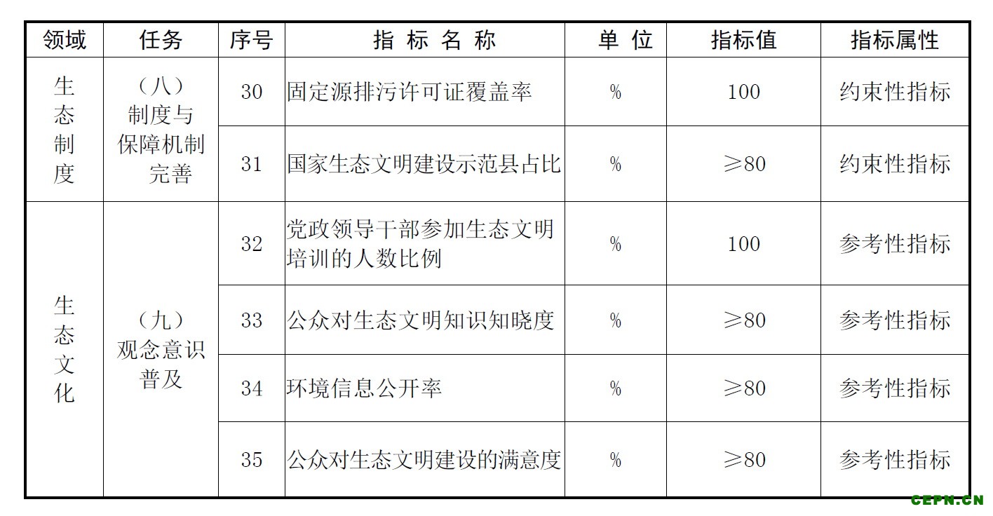 此外,示范地区的区域大气环境质量不降低并达到考核目标。基本消除行政区内严重污染天数(占全年有效监测天数的比例不超过1%)。地表水达到水环境功能区标准,且I、II类水质比例不降低,过境河流市控以上断面水质不降低。基本消除行政区内劣V类水体(占比不超过5%)。区域土壤环境质量不降低并达到考核目标。生态环境状况指数(EI)保持在优良水平,且不降低。饮用水水质符合国家《生活饮用水卫生标准》(GB5749-2006)的规定,且连续三年未发生饮用水污染事故,等等。