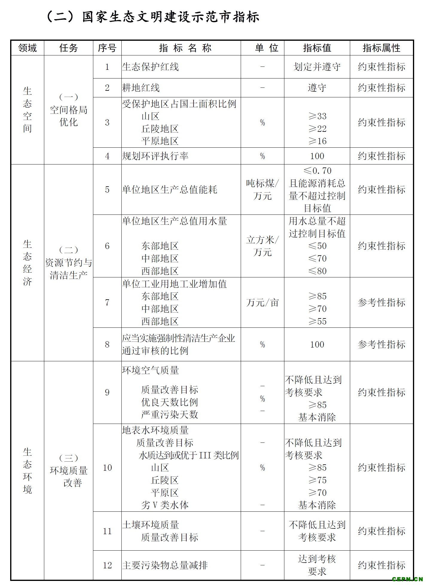 根据《国家生态文明建设示范县、市指标(试行)》,示范地生态保护红线一经划定,不得随意调整,确保面积不减少、质量不下降。能源消耗总量不超过国家或上级政府下达的关于区域能源消耗总量控制目标。水资源消耗总量不超过国家或上级政府下达的水资源总量控制目标。